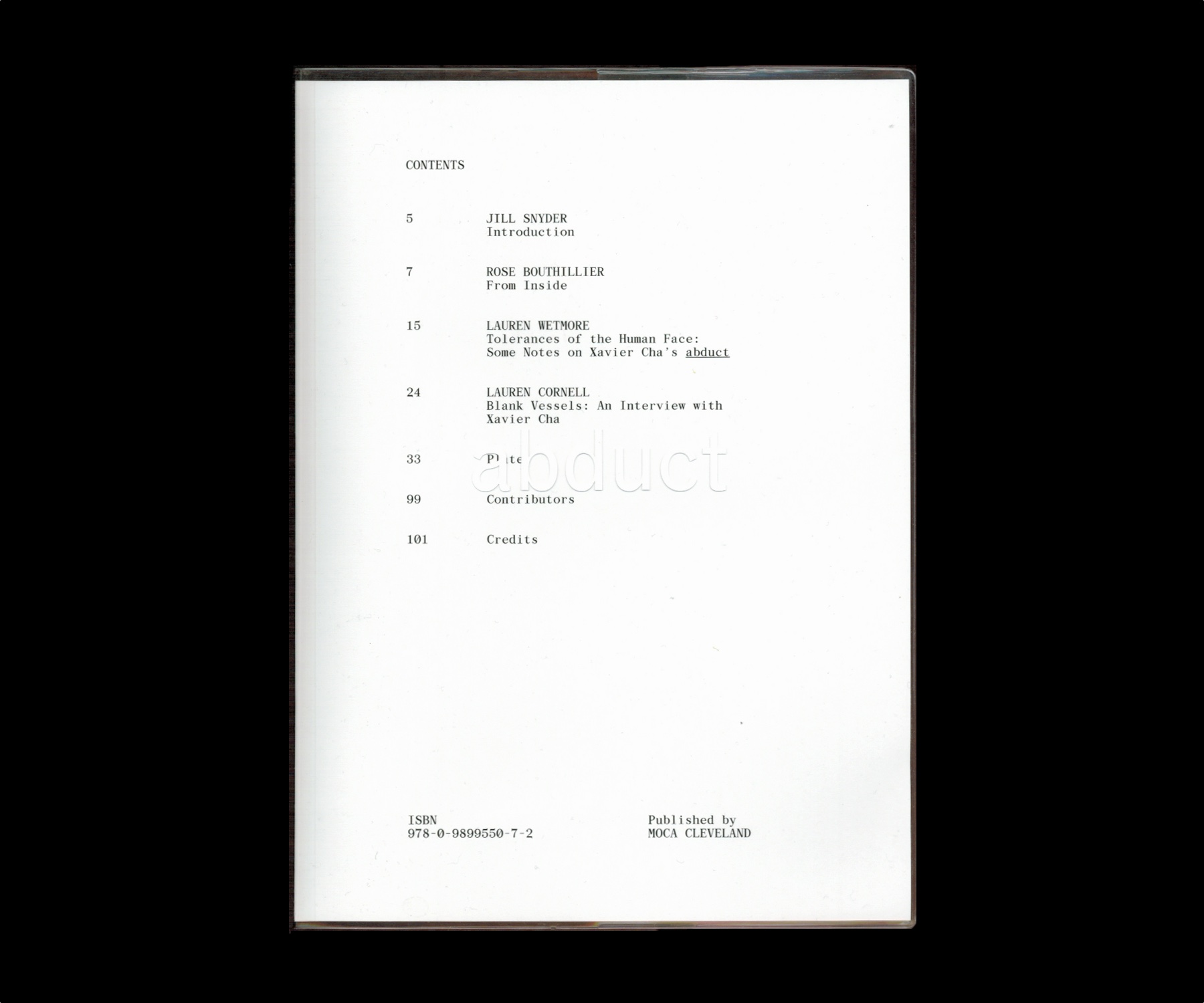 Xavier Cha: Abduct, an exhibition catalogue for MOCA Cleveland.